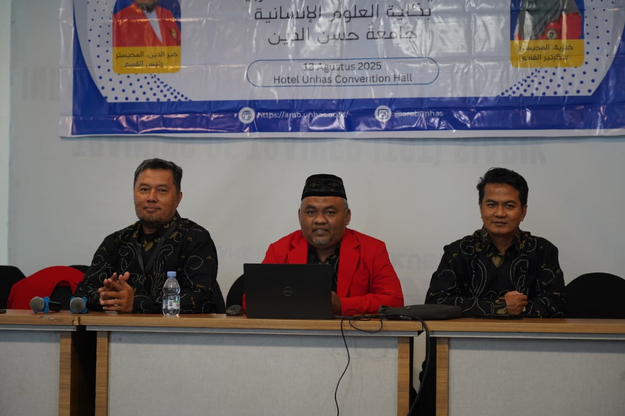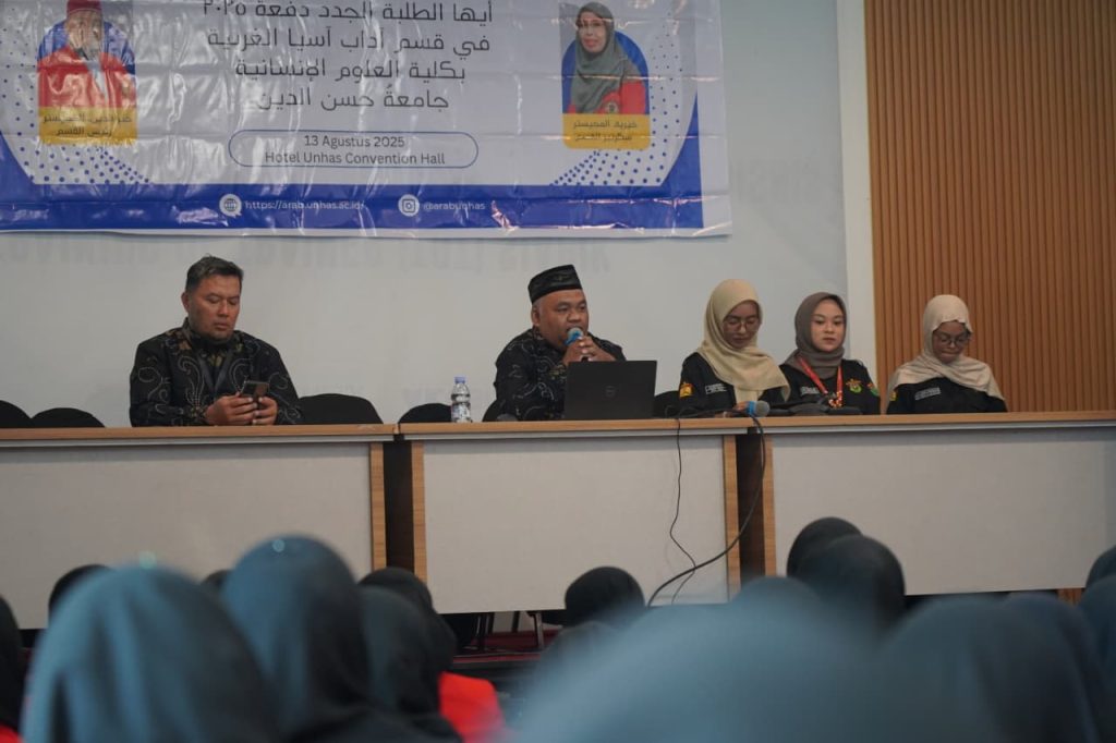 Program Studi Sastra Arab, Fakultas Ilmu Budaya, Universitas Hasanuddin, menggelar Penerimaan Mahasiswa Baru (PMB) Angkatan 2025 pada Rabu, 13 Agustus 2025, bertempat di Hotel Unhas. Kegiatan ini dihadiri oleh seluruh dosen dan tenaga kependidikan Prodi Sastra Arab, pengurus Himpunan Mahasiswa Sastra Arab (HIMAB), serta mahasiswa baru yang antusias memulai perjalanan akademik mereka.